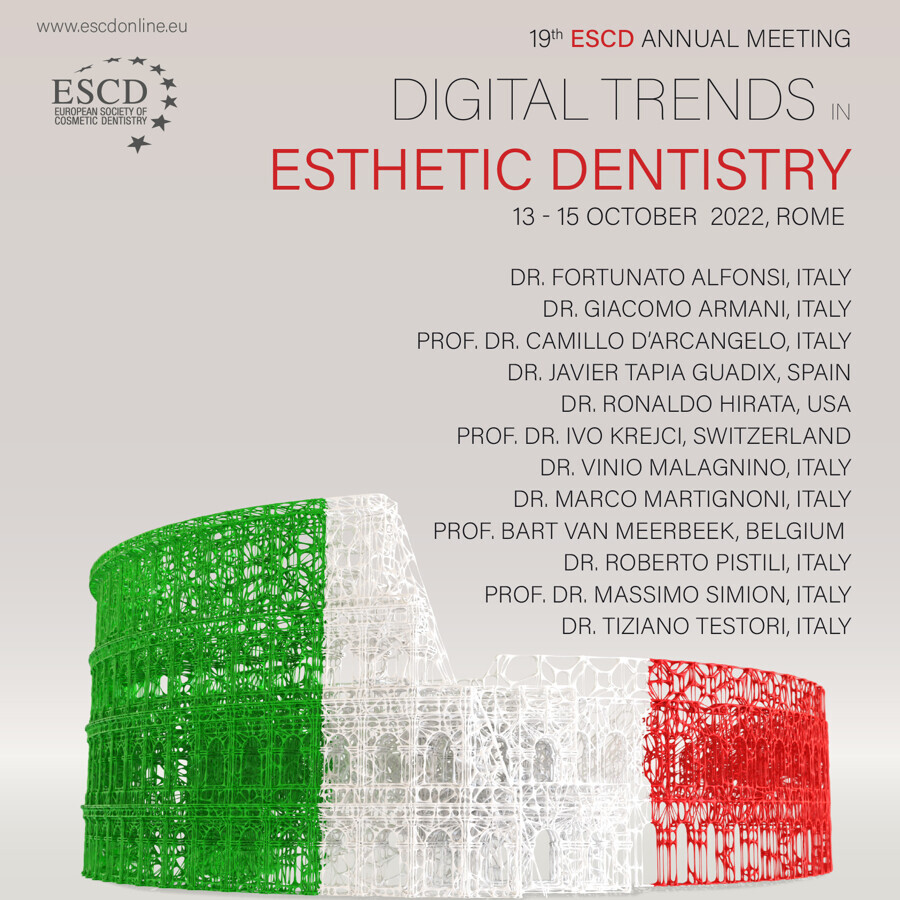 Cel de-al 19-lea congres anual a Societății Europene de Cosmetică Dentară (ESCD) este programată să aibă loc în orașul antic Roma, Italia, în luna octombrie. Societatea a fost fondată în 2003 de un grup de stomatologi vizionari din toată Europa pentru a oferi stomatologilor oportunități de învățare de clasă mondială în domeniul stomatologiei estetice și cosmetice.